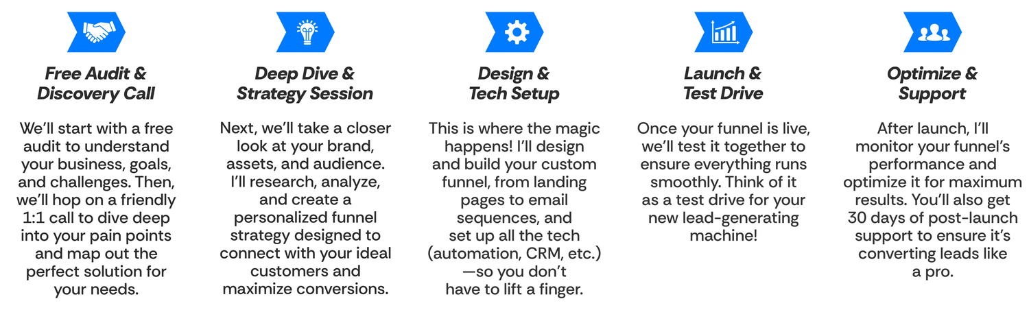 Tech Integration & Automation: Seamless setup of your funnel tech (e.g., email marketing, CRM, payment gateways).